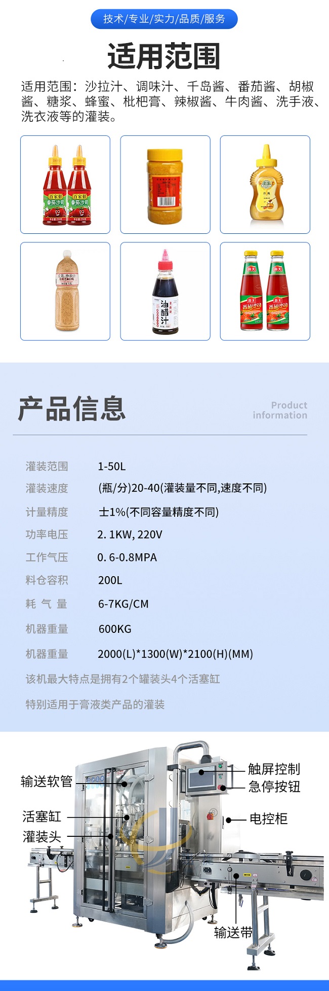 這款全自動跟蹤式醬料灌裝機是本公司研發的新款專為醬廠研發的生產設備,跟蹤式醬料灌裝機適用范圍:沙拉汁、調味汁、千島醬、番茄醬、胡椒醬、糖漿、蜂蜜、枇杷膏、辣椒醬、牛肉醬、洗手液、洗衣液等的灌裝。