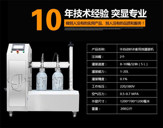 本機適用于花生油、大豆油、菜籽油、色拉油、芝麻油、石油化工潤滑油等各種油類和粘稠液體的定量要求。半自動雙頭電動BSB食用油灌裝機:采用的微電腦技術(shù),自備動力,管路無需加壓,節(jié)約運行成本;自動檢測油浙、自動修正溫度變化引起的密度變化,適合大溫差環(huán)境的油品灌裝工作,使用方便靈活;機電一體化設(shè)計,安裝方便,整機價格低廉。
