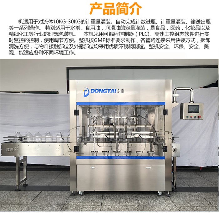 機(jī)適用于對(duì)流體5kg-30kg的計(jì)重量灌裝。自動(dòng)完成計(jì)數(shù)進(jìn)瓶、計(jì)重量灌裝、輸送出瓶等一系列操作。 特別適用于水劑、食用油,潤(rùn)滑油的定量灌裝,是食品,醫(yī)藥,化妝品以及精細(xì)化工等行業(yè)的包裝機(jī)。本機(jī)采用可編程控制器(PLC)、高速工控組態(tài)軟件進(jìn)行實(shí)時(shí)監(jiān)控的控制,使用調(diào)節(jié)方便。整機(jī)按GMP標(biāo)準(zhǔn)要求制作,各管路連接采用快裝方式,拆卸清洗方便,與物料接觸部位及外露部位均采用優(yōu)質(zhì)不銹鋼制造。整機(jī)安全、環(huán)保、安全、美觀、能適應(yīng)各種不同環(huán)境工作。