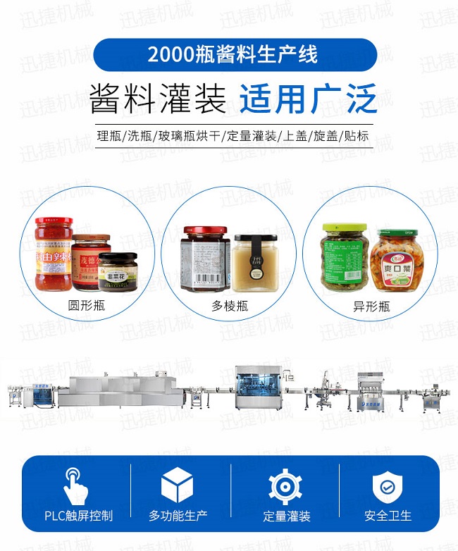 牛肉顆粒醬各種各樣的包裝方式在我們的生活中并不少見,隨著牛肉顆粒醬灌裝豐富化時代的到來,那么針對這么多包裝需求只要選擇這款全自動牛肉顆粒醬灌裝機設備就可以輕松的去實現多樣化的包裝方法,具備無滴漏灌裝;管道采用快裝式鏈接,完全符合衛生要求,拆洗維護方便;全自動牛肉顆粒醬灌裝機設備還保障了瓶口干凈衛生,輸送帶干凈衛生,符合GMP標準有著操作調節便利,無瓶不灌裝,自動檢測,計數等一些類比較出色的優勢特點,迅捷機械可根據客戶需求配理瓶機、旋蓋機,貼標機,打碼機等設備來實現自身企業的實際生產需求。